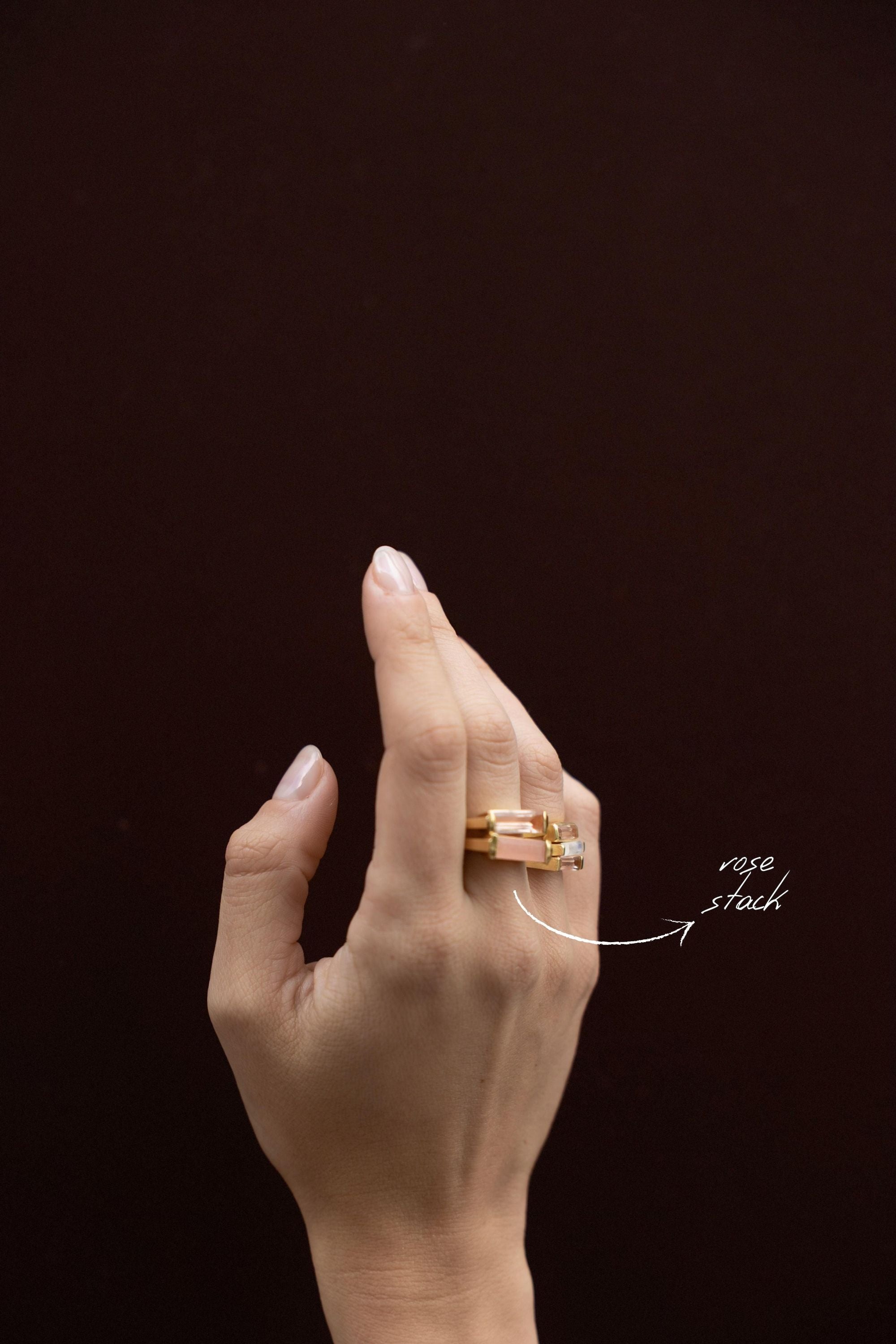 Les gemmes sont taillées avec une précision remarquable : un cabochon de 8 × 11 mm, une pierre taille radiant de 10 × 31 mm et une élégante taille baguette de 6 × 13 mm composent une harmonie de formes et de proportions qui magnifie la silhouette de la pièce. L’ensemble est rehaussé d’une finition mate, obtenue par électroplacage, qui confère à la création une modernité subtile et un caractère intemporel.